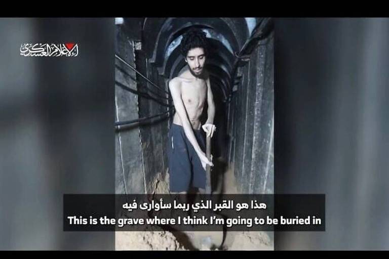 Um vídeo divulgado neste final de semana pelo Hamas vem provocando revolta em Israel. A gravação parece mostrar Evyatar David, uma das cerca de 250 pessoas feitas reféns durante os ataques liderados pelo Hamas em 7 de outubro de 2023, visivelmente magro, com os ossos aparecendo sob a pele. David cava uma sepultura e diz para a câmera que é onde “provavelmente será enterrado”. As imagens mostram ainda crianças palestinas morrendo de fome.